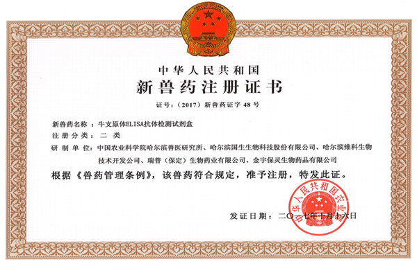 熱烈祝賀哈爾濱國生生物科技股份有限公司“牛支原體ELISA抗體檢測(cè)試劑盒”獲得新獸藥注冊(cè)證書